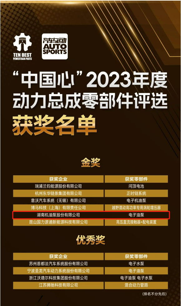 2023年11月8日 ,“中國心”2023年度動(dòng)力總成零部件評選公布,湖南機(jī)油泵股份有限公司研發(fā)的電子油泵作為動(dòng)力總成潤滑系統(tǒng)的“心臟”,榮獲了業(yè)界具影響力的金獎(jiǎng)。這一殊榮不僅是對湖南機(jī)油泵不懈追求卓越品質(zhì)和技術(shù)領(lǐng)先地位的認(rèn)可,也標(biāo)志著公司在全球動(dòng)力總成領(lǐng)域的領(lǐng)跑者地位。